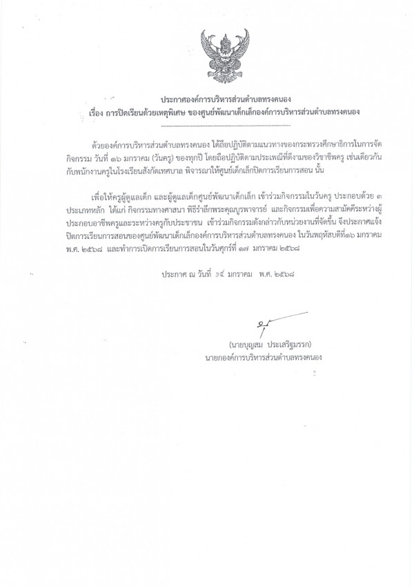 ประกาศองค์การบริหารส่วนตำบลทรงคนอง เรื่อง การปิดการเรียนด้วยเหตุพิเศษ ของศูนย์พัฒนาเด็กเล็กองค์การบริหารส่วนตำบลทรงคนอง ในวันพฤหัสบดีที่ 16 มกราคม พ.ศ. 2568 และทำการเปิดการเรียนการสอนในวันศุกร์ที่ 17 มกราคม พ.ศ. 2568