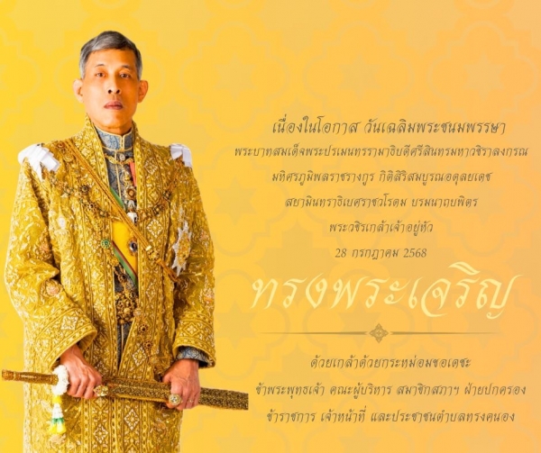 28 กรกฎาคม 2568 วันเฉลิมพระชนมพรรษาพระบาทสมเด็จพระปรเมนทรรามาธิบดีศรีสินทรมหาวชิราลงกรณ มหิศรภูมิพลราชวรางกูร กิติสิริสมบูรณอดุลยเดช สยามินทราธิเบศราชวโรดม บรมนาถบพิตร พระวชิรเกล้าเจ้าอยู่หัว