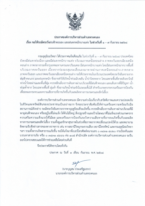 ประกาศองค์การบริหารส่วนตำบลทรงคนอง เรื่อง ขอให้ระมัดระวังฝนฟ้าคะนอง และฝนตกหนักบางแห่ง ในช่วงวันที่ 1-7 กันยายน 2568