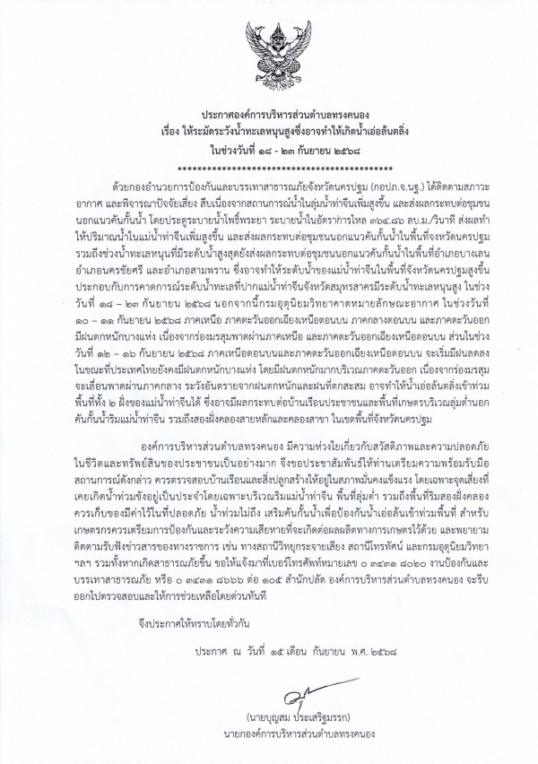 ประกาศองค์การบริหารส่วนตำบลทรงคนอง เรื่อง ให้ระมัดระวังน้ำทะเลหนุนสูงซึ่งอาจทำให้เกิดน้ำเอ่อล้นตลิ่ง ในช่วงวันที่ 18 - 23 กันยายน 2568
