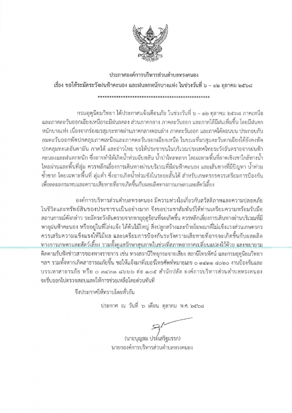 ประกาศองค์การบริหารส่วนตำบลทรงคนอง เรื่อง ขอให้ระมัดระวังฝนฟ้าคะนอง และฝนตกหนักบางแห่ง ในช่วงวันที่ 6 -12 ตุลาคม 2568