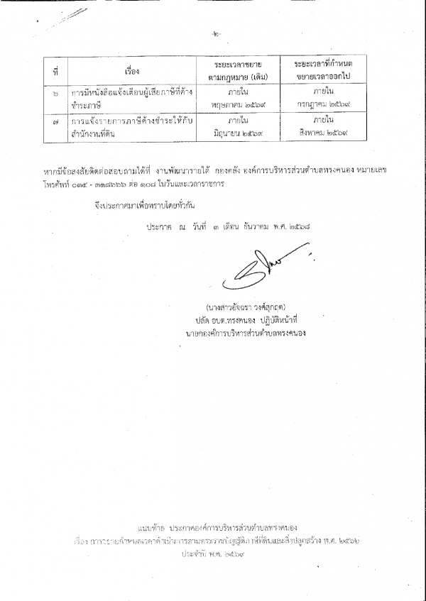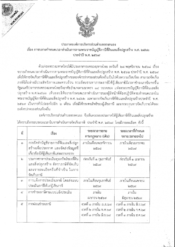 ประกาศองค์การบริหารส่วนตำบลทรงคนอง เรื่อง การขยายกำหนดเวลาดำเนินการตามพระราชบัญญัติภาษีที่ดินและสิ่งปลูกสร้าง พ.ศ. 2562 ประจำปี พ.ศ. 2569