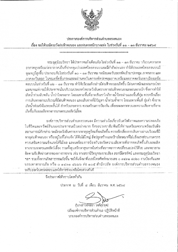 ประกาศองค์การบริหารส่วนตำบลทรงคนอง เรื่อง ขอให้ระมัดระวังฝนฟ้าคะนอง และฝนตกหนักบางแห่ง ในช่วงวันที่ 11 - 13 ธันวาคม 2568