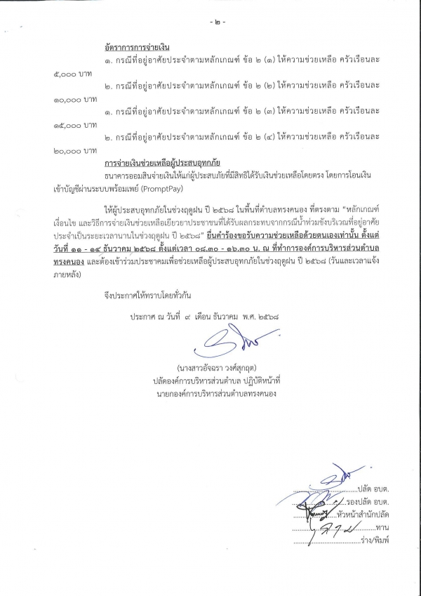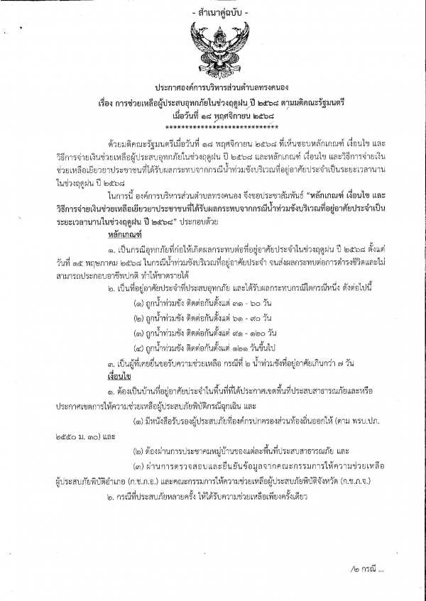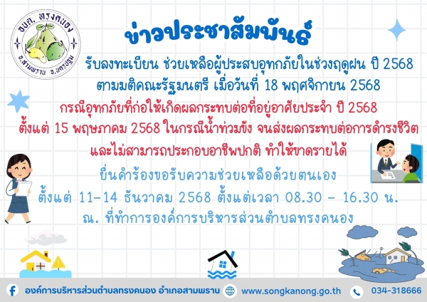ประกาศองค์การบริหารส่วนตำบลทรงคนอง เรื่อง การช่วยเหลือผู้ประสบอุทกภัยในช่วงฤดูฝน ปี 2568 ตามมติคณะรัฐมนตรี เมื่อวันที่ 18 พฤศจิกายน 2568